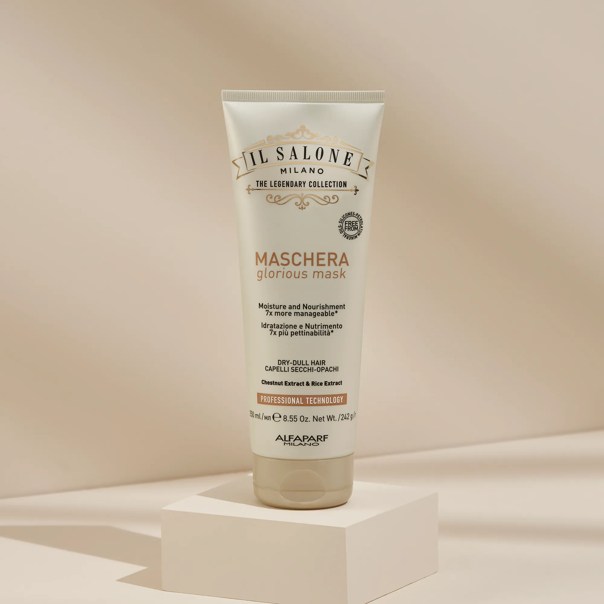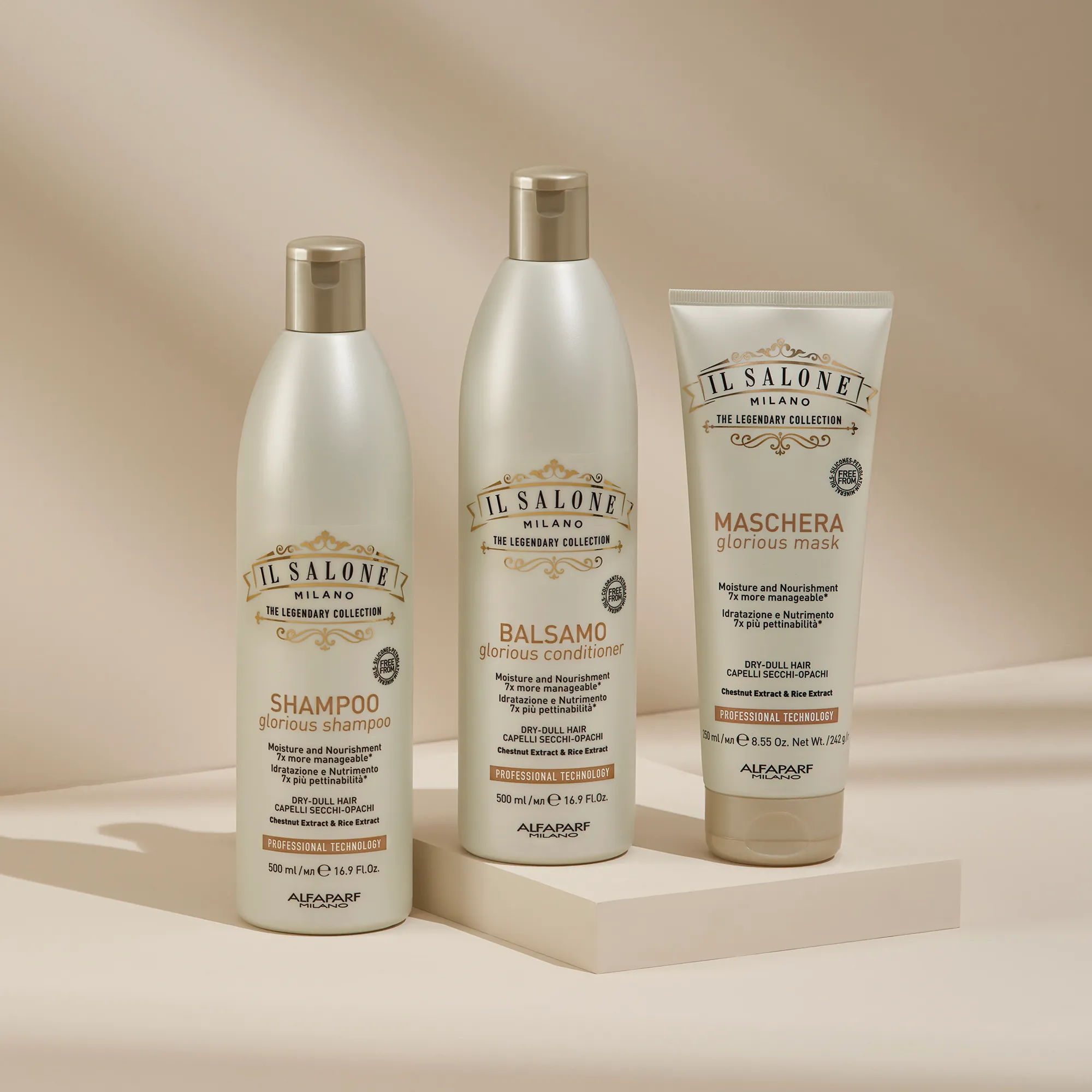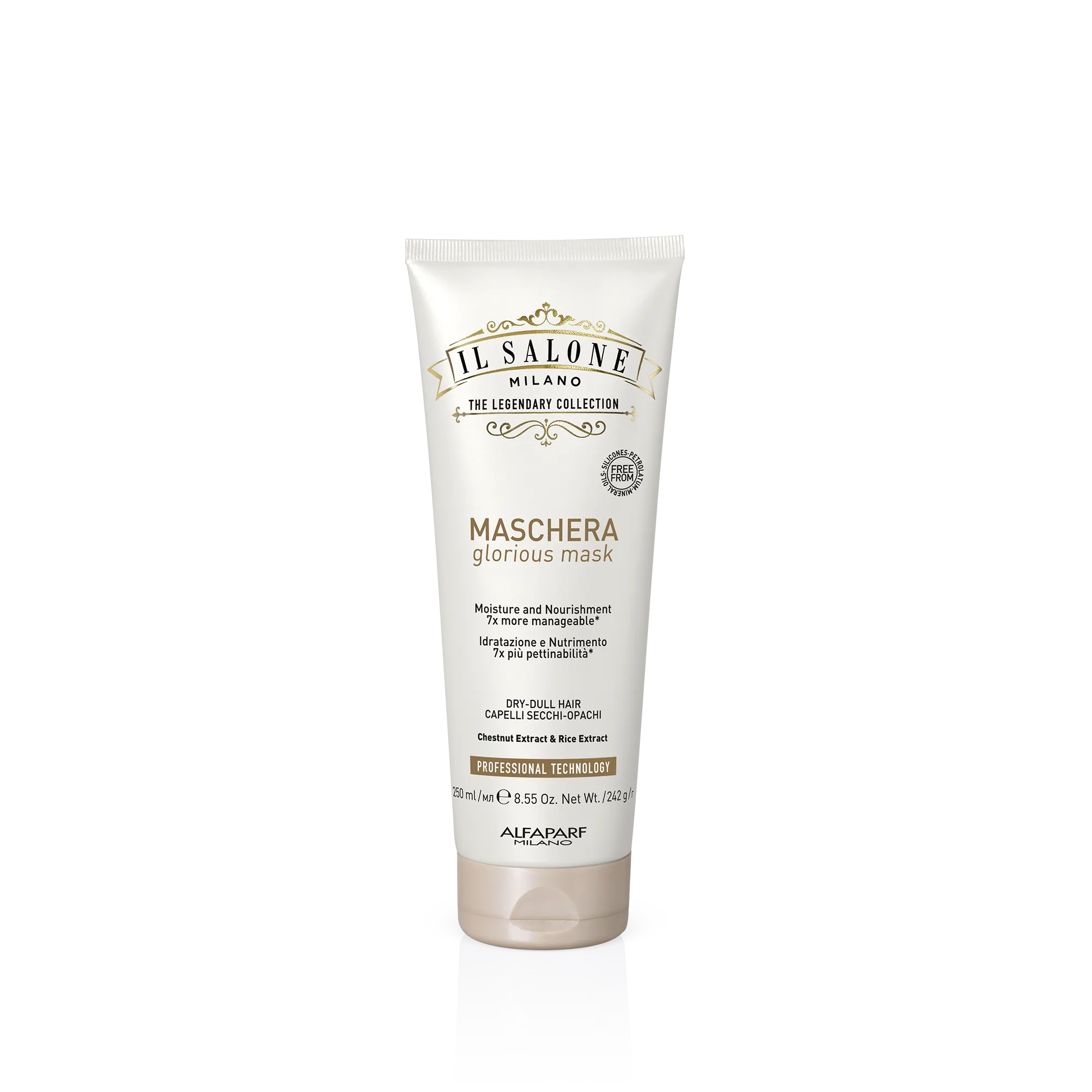 Відкрийте для себе всю лінійку продуктів Glorious : створені на основі екстракту каштана, екстракту рису, протеїнів пшениці та керамідів, вони глибоко живлять і зволожують волосся, надаючи йому нової життєвої сили. Веганські формули free from парафінів, петролатуму, мінеральних олій та барвників.