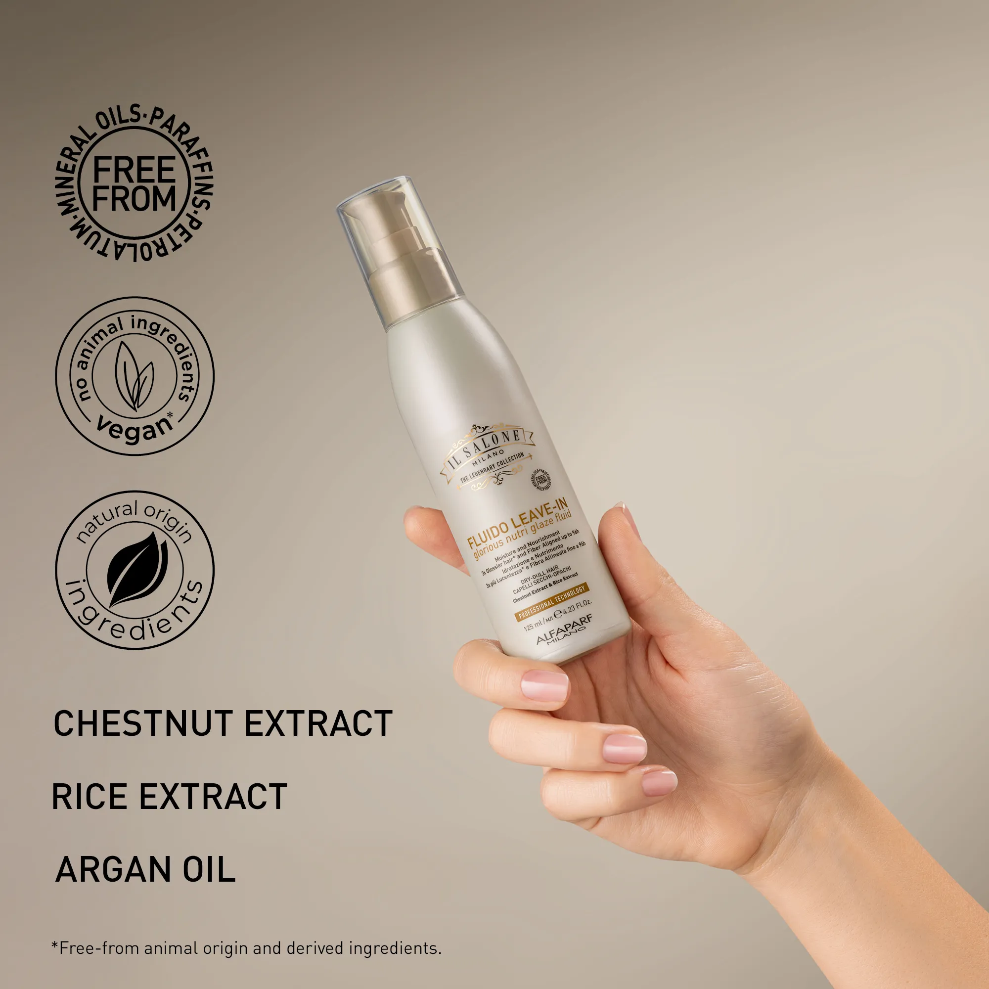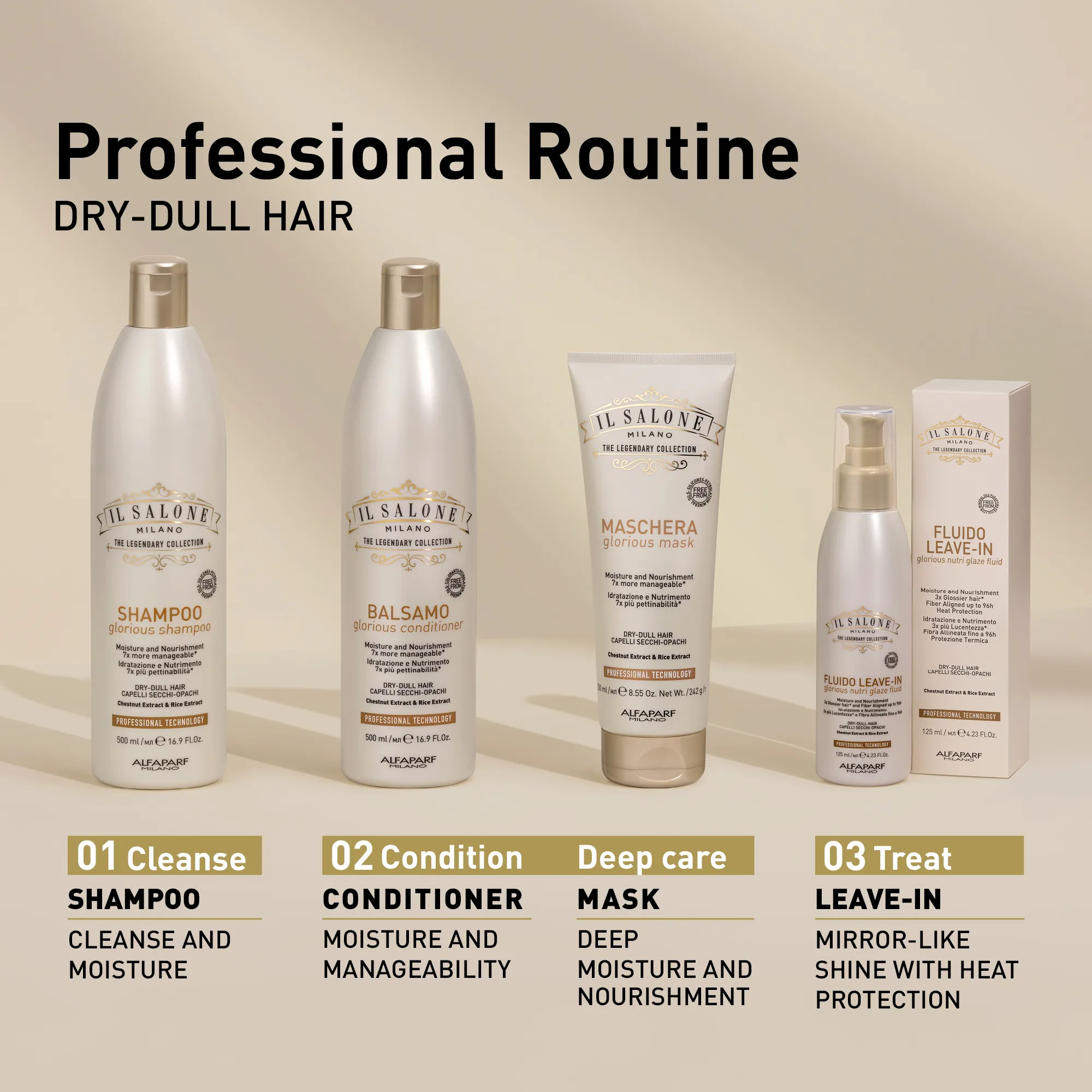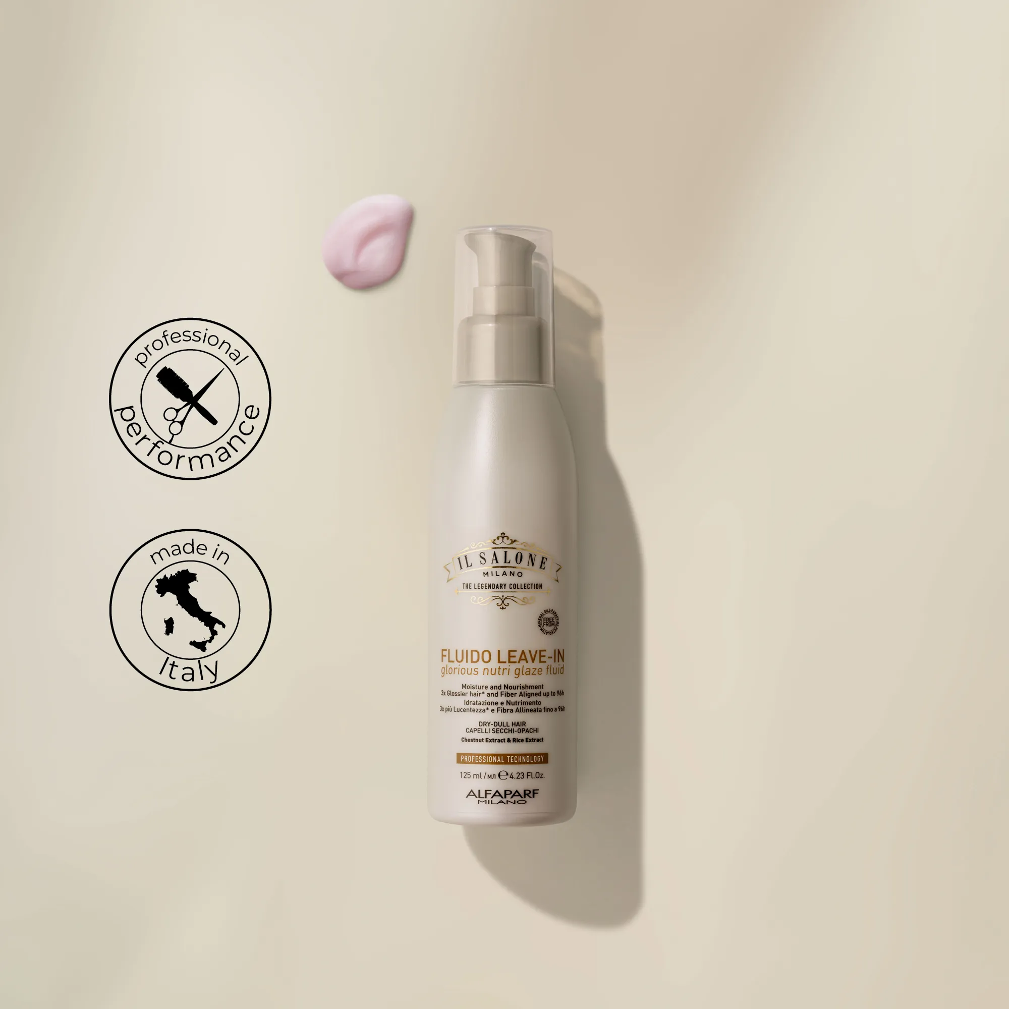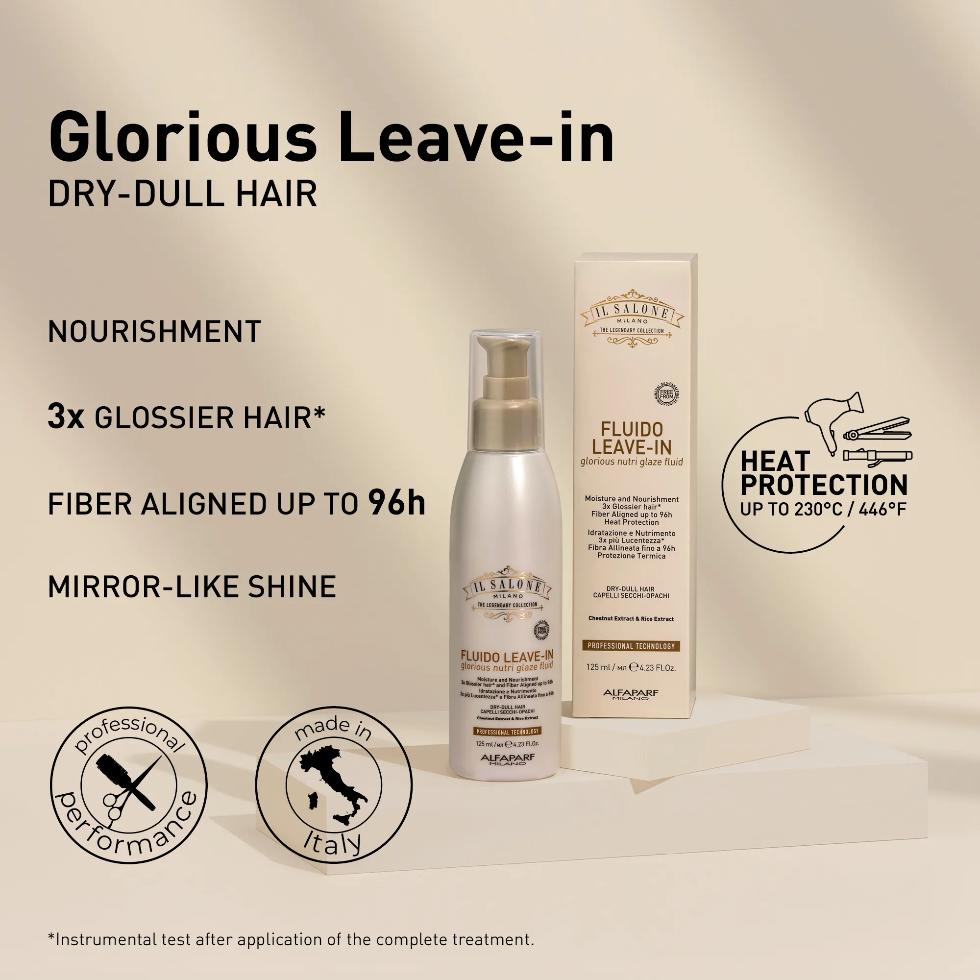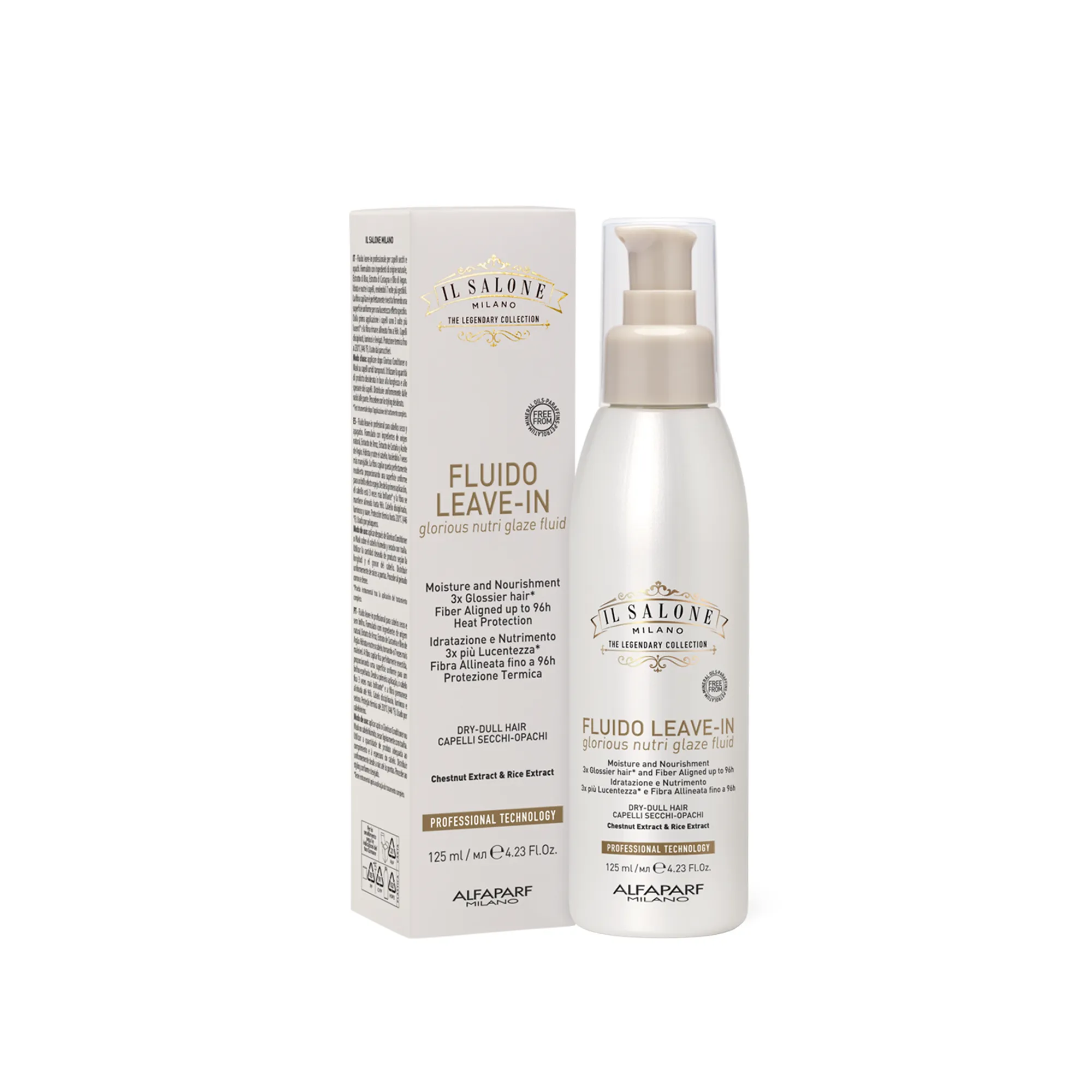 Професійний флюїд без змивання для сухого та тьмяного волосся. Містить інгредієнти природного походження: екстракт рису, екстракт каштана та арганову олію. Зволожує та живить волосся, роблячи його у 7 разів слухнянішим. Волокна волосся ідеально покриваються, створюючи рівну поверхню для дзеркального блиску. Вже після першого застосування волосся стає в 3 рази блискучішим*, а волокна волосся вирівнюються на строк до 96 годин. Послухне, гладке та блискуче волосся. Термозахист до 230 °C (446 °F). Використовується перукарями.