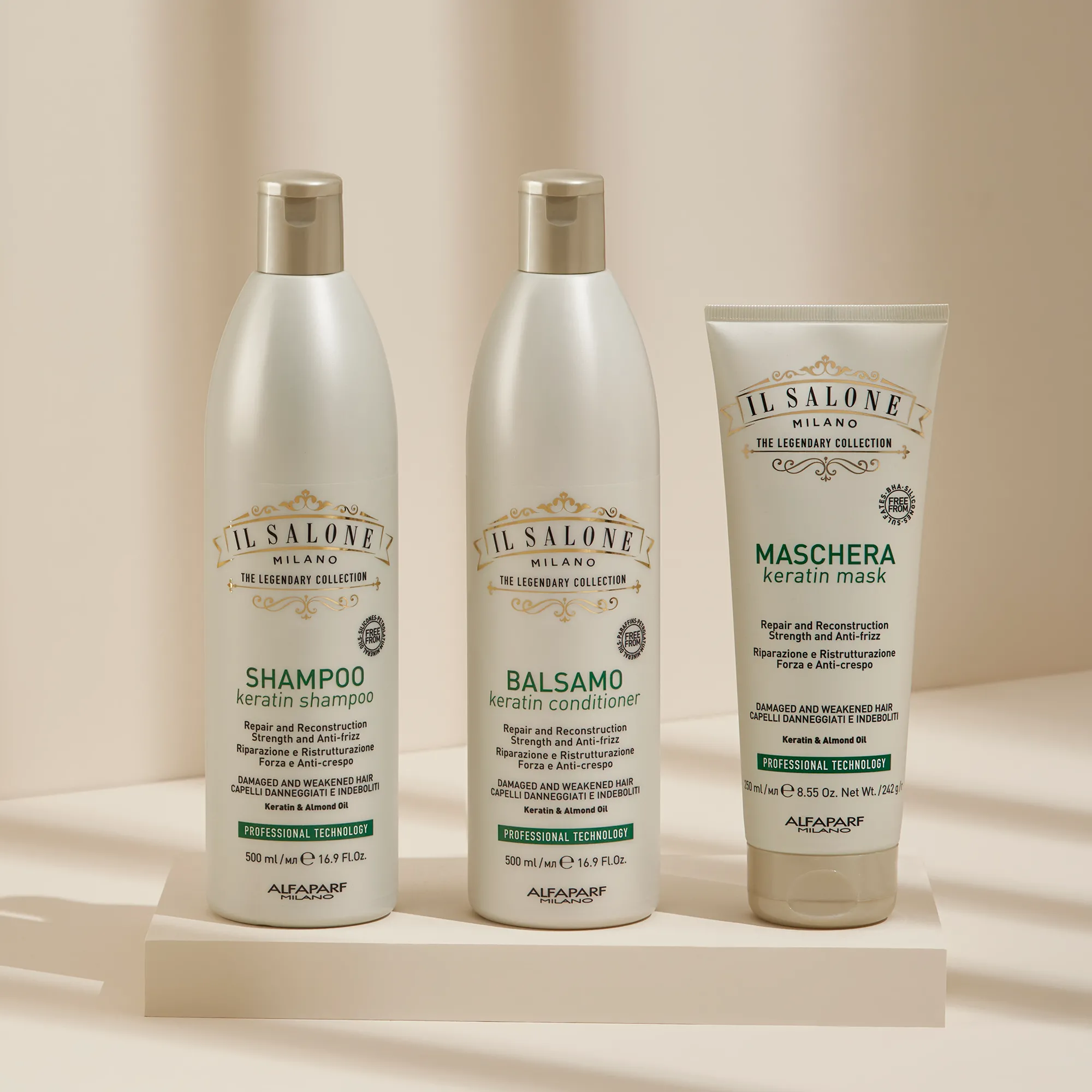 Професійна лінія продуктів Keratin відновлює, регенерує та зміцнює волосся. Антифриз*.